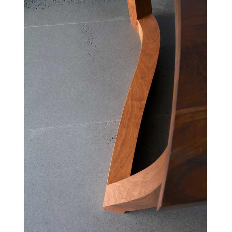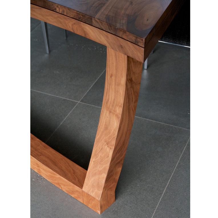In 2013 Anton Gerner was commissioned to design and make this unique dining table for a contemporary Melbourne home. The brief was for a table to seat up to 14 people, with seating to be along the long sides of the table only. The result is this sculptural design that challenges what is possible to construct from wood. The 4.2m unsupported span and twisted legs are achieved by a hidden, engineer designed, steel frame.
